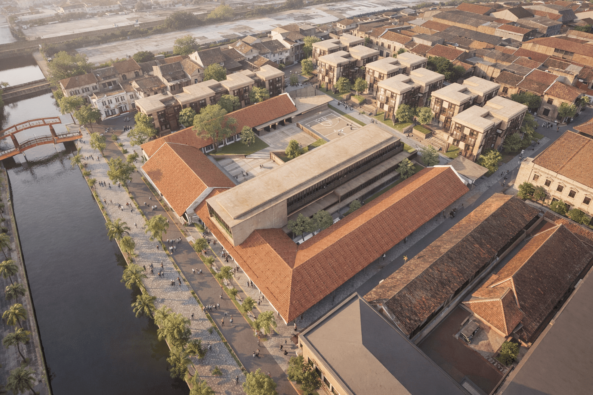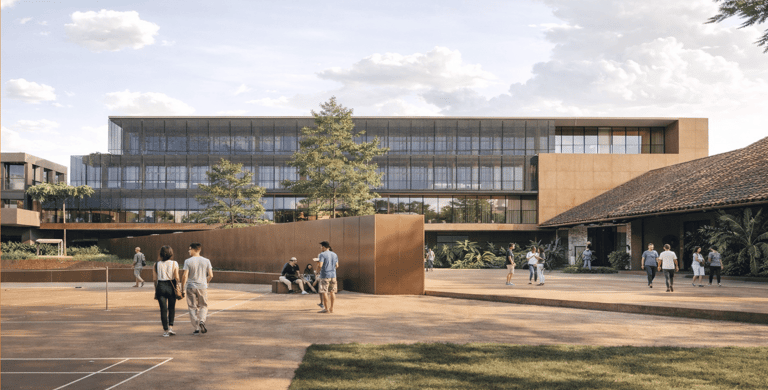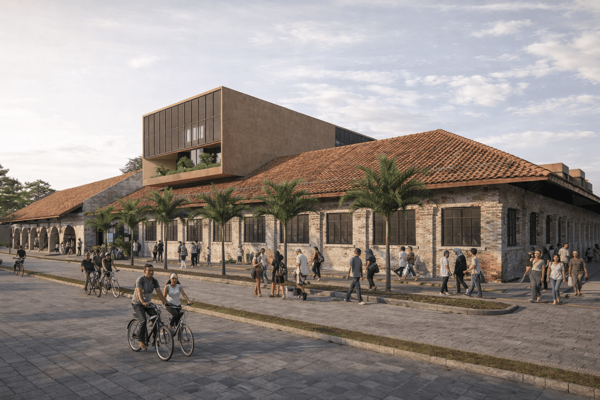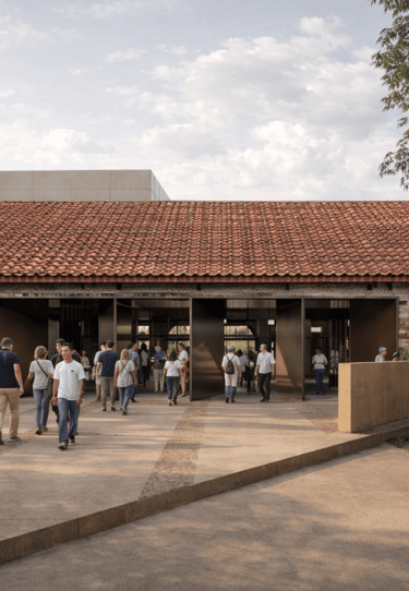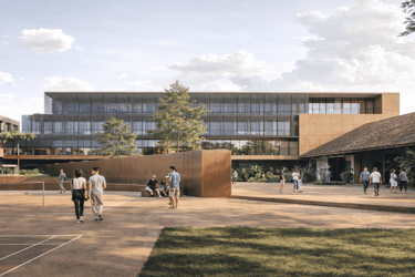 The proposed design for the Lembaga Penjamin Simpanan (LPS) in the new capital city of Nusantara embodies the Indonesian principle of Gotong Royong, serving as a vital nexus between the Bank of Indonesia, OJK, and LPS itself. Five key design principles shape this vision. Three imaginary axes converge at the site's center, metaphorically bridging the gap between the institutions. This convergence forms a symbolic bridge, while also functioning practically as the entrance plaza, fostering connectivity and collaboration. Diagonal axes delineate the boundary between the built environment and nature, creating a balance. The design preserves a significant open space to the south, facilitating dialogue and connection with the verdant landscape. Inspired by the graceful silhouette of temples, the three buildings cascade along the sloping topography. This arrangement ensures a seamless integration into the capital skyline, evoking a sense of cultural continuity.