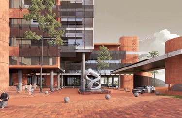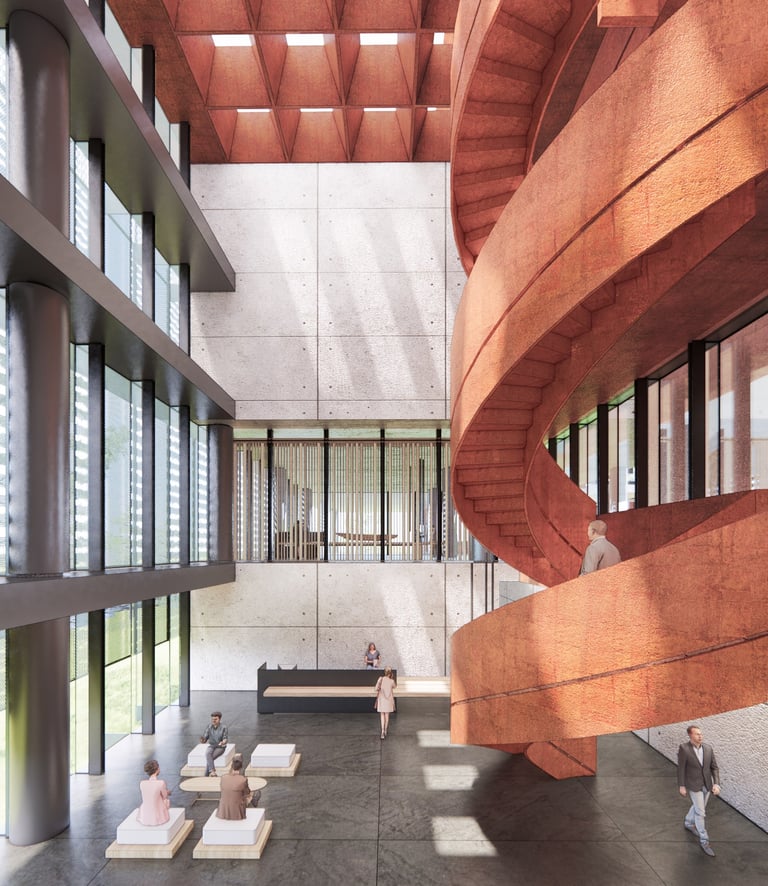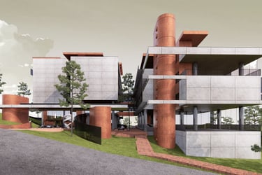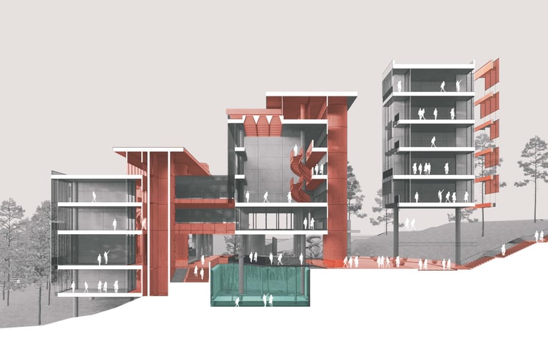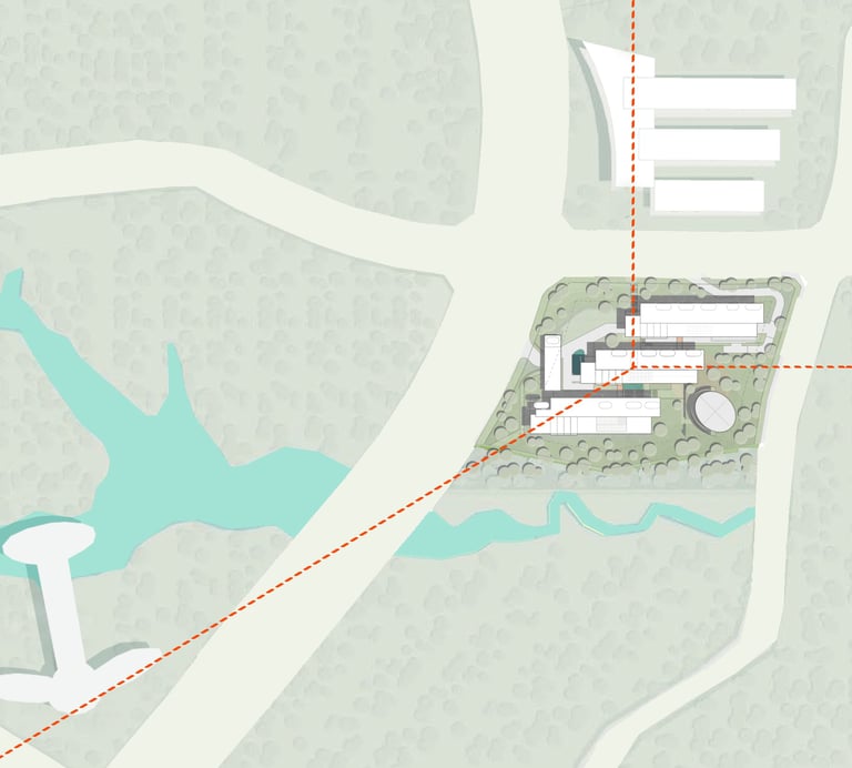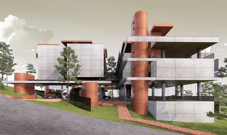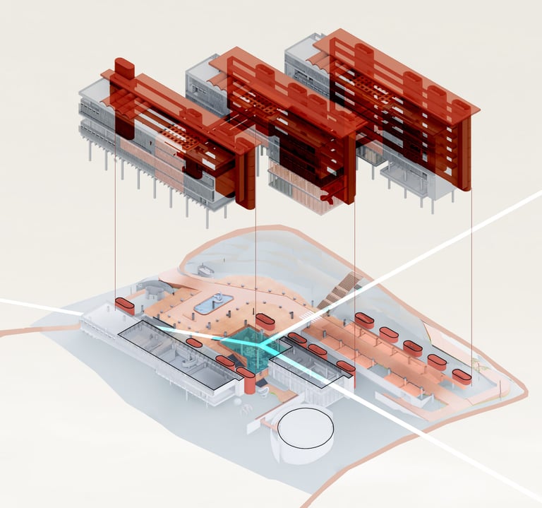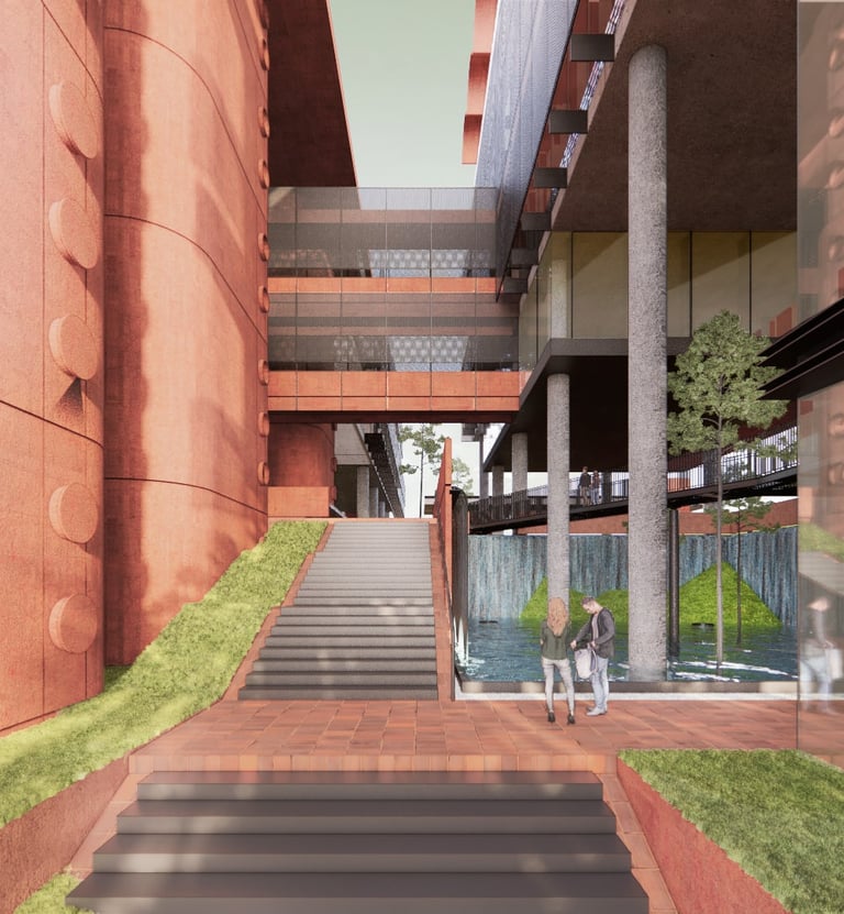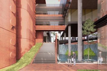 The proposed design for the Lembaga Penjamin Simpanan (LPS) in the new capital city of Nusantara embodies the Indonesian principle of Gotong Royong, serving as a vital nexus between the Bank of Indonesia, OJK, and LPS itself. Five key design principles shape this vision. Three imaginary axes converge at the site's center, metaphorically bridging the gap between the institutions. This convergence forms a symbolic bridge, while also functioning practically as the entrance plaza, fostering connectivity and collaboration. Diagonal axes delineate the boundary between the built environment and nature, creating a balance. The design preserves a significant open space to the south, facilitating dialogue and connection with the verdant landscape. Inspired by the graceful silhouette of temples, the three buildings cascade along the sloping topography. This arrangement ensures a seamless integration into the capital skyline, evoking a sense of cultural continuity. Analogous to the network of organisms, the design emphasizes efficient connectivity between divisions of LPS. A network of linking bridges at various levels facilitates seamless movement and interaction, enhancing the institution's cohesion. Elliptical cores, akin to the structure of human spines, serve as the backbone of the building, housing essential functions such as elevators, toilets, and mechanical systems. Positioned on the northern side, these cores optimize space utilization while directing the main activities towards the south, fostering a deeper connection with human occupants and the surrounding natural environment