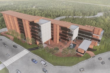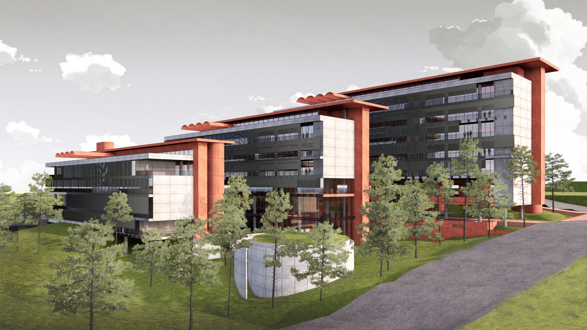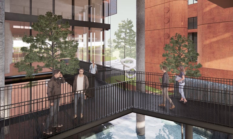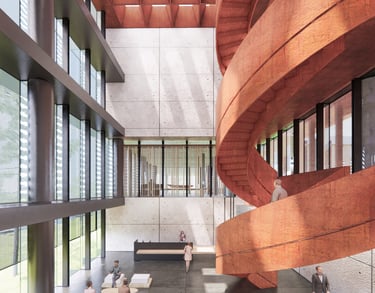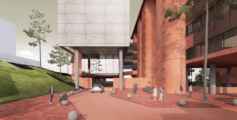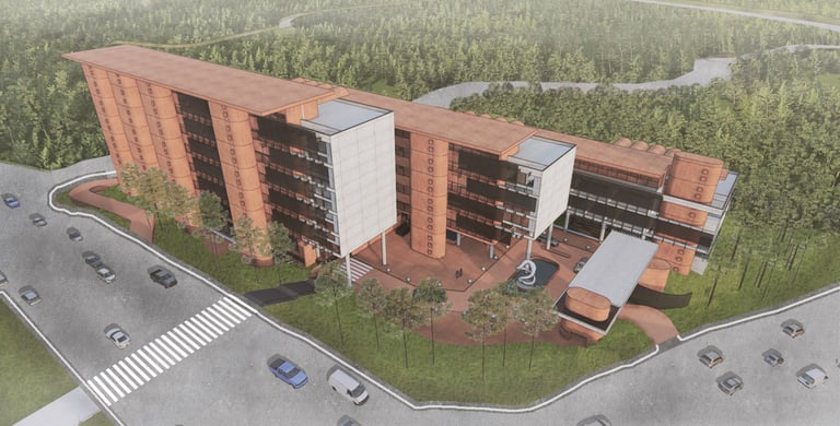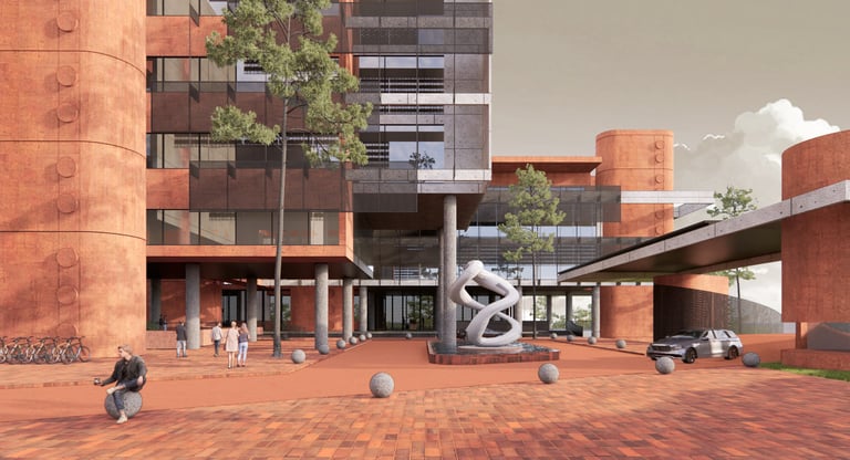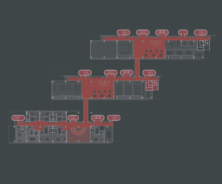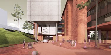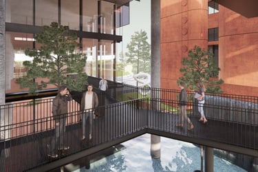The proposed design for the Lembaga Penjamin Simpanan (LPS) in the new capital city of Nusantara embodies the Indonesian principle of Gotong Royong, serving as a vital nexus between the Bank of Indonesia, OJK, and LPS itself. Five key design principles shape this vision. Three imaginary axes converge at the site's center, metaphorically bridging the gap between the institutions. This convergence forms a symbolic bridge, while also functioning practically as the entrance plaza, fostering connectivity and collaboration. Diagonal axes delineate the boundary between the built environment and nature, creating a balance. The design preserves a significant open space to the south, facilitating dialogue and connection with the verdant landscape. Inspired by the graceful silhouette of temples, the three buildings cascade along the sloping topography. This arrangement ensures a seamless integration into the capital skyline, evoking a sense of cultural continuity. Analogous to the network of organisms, the design emphasizes efficient connectivity between divisions of LPS. A network of linking bridges at various levels facilitates seamless movement and interaction, enhancing the institution's cohesion. Elliptical cores, akin to the structure of human spines, serve as the backbone of the building, housing essential functions such as elevators, toilets, and mechanical systems. Positioned on the northern side, these cores optimize space utilization while directing the main activities towards the south, fostering a deeper connection with human occupants and the surrounding natural environment