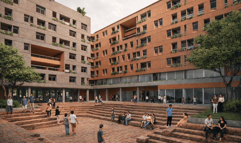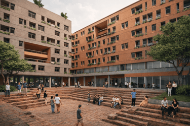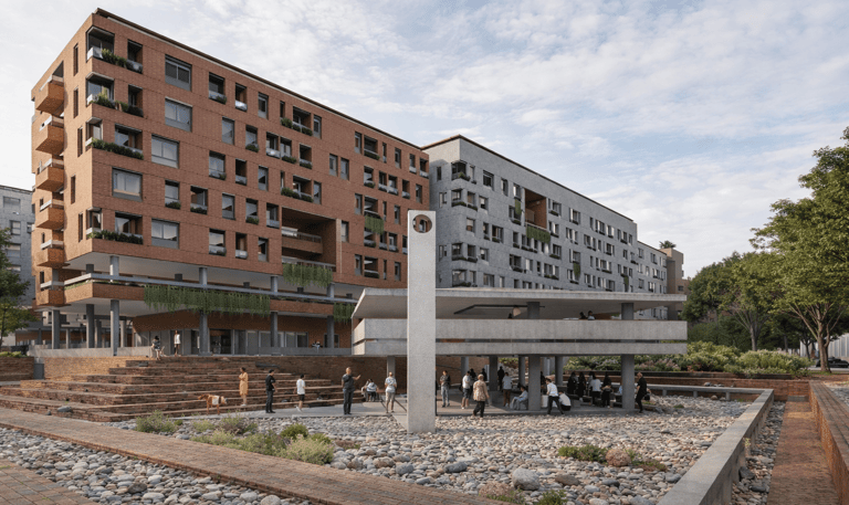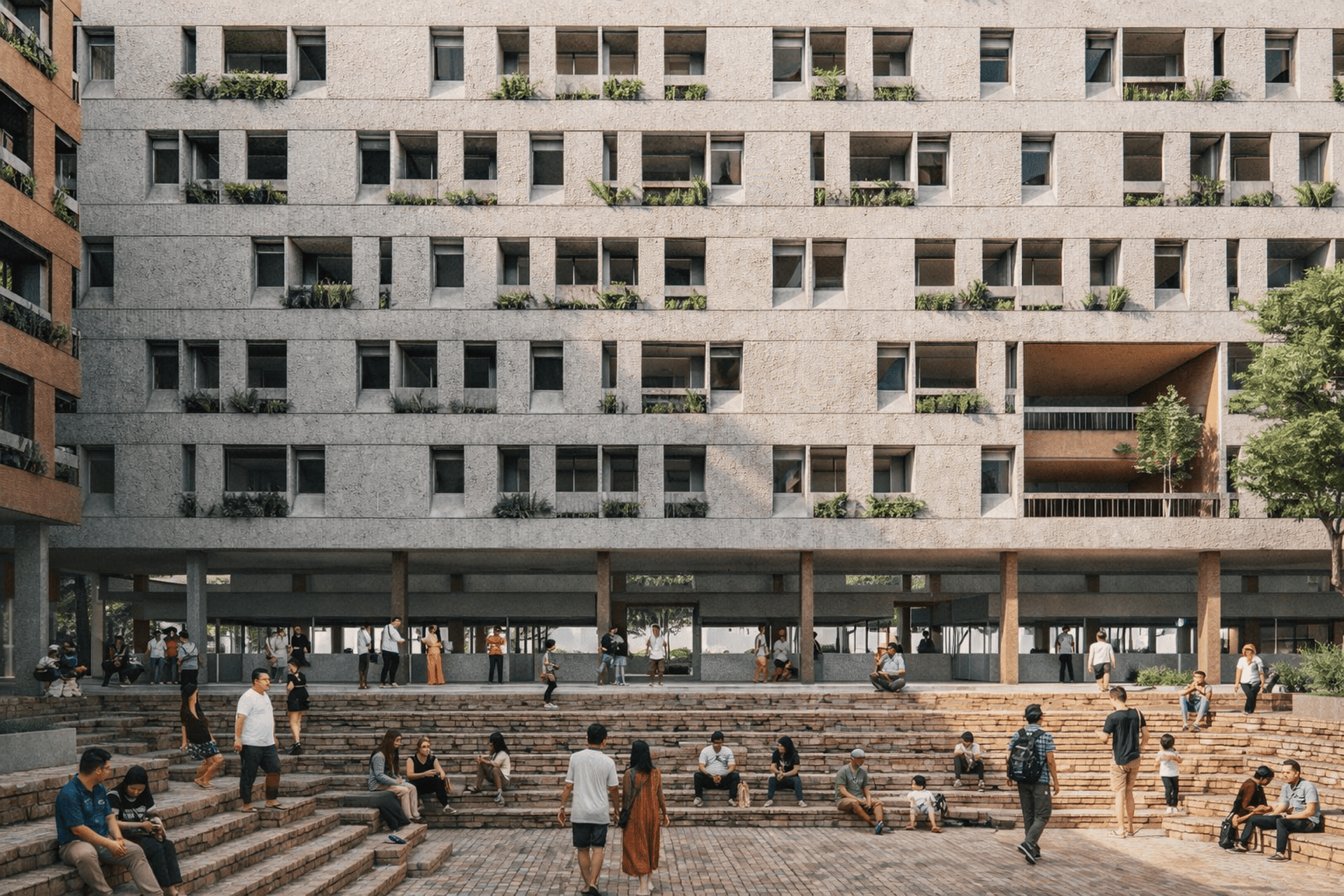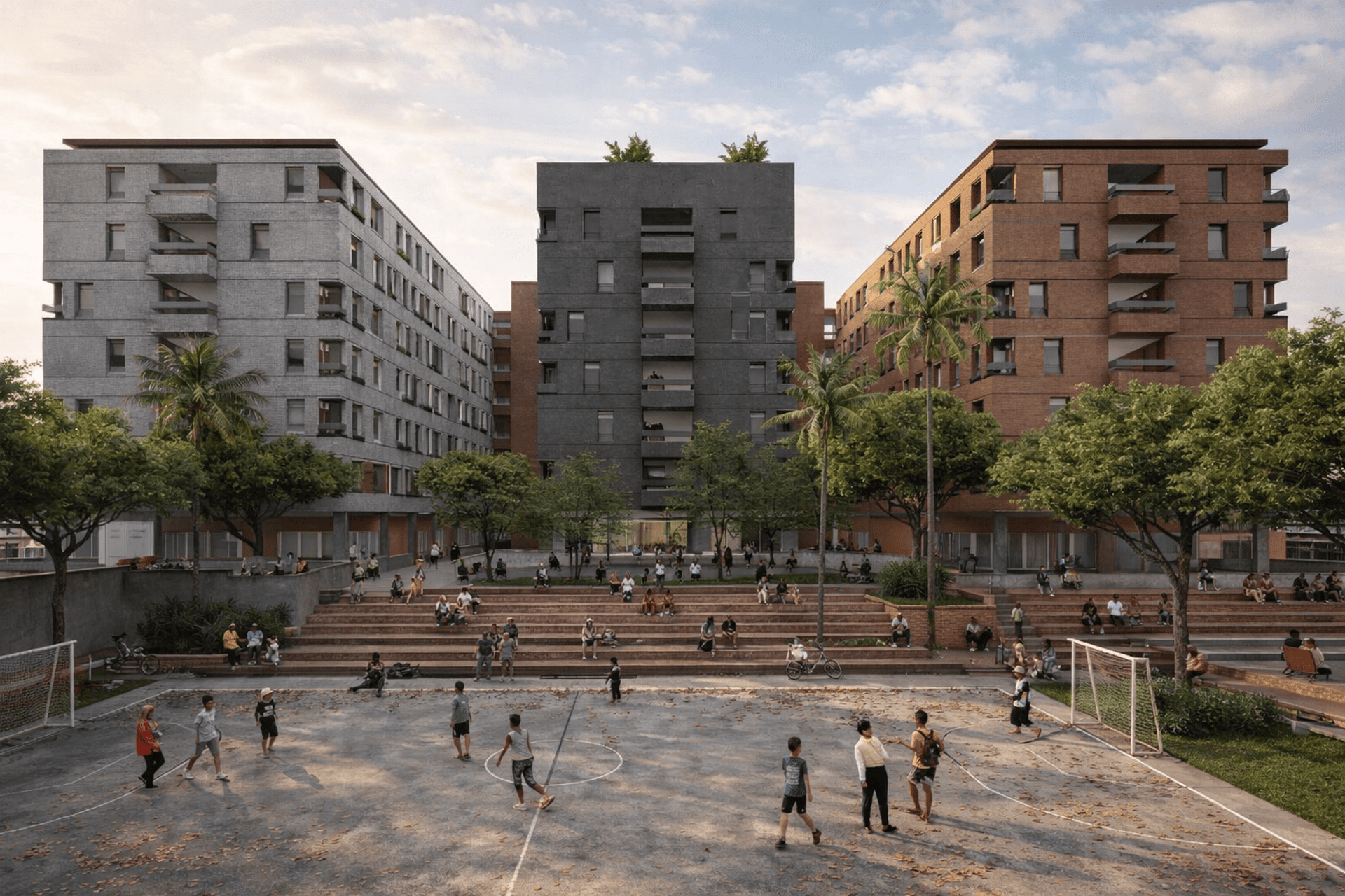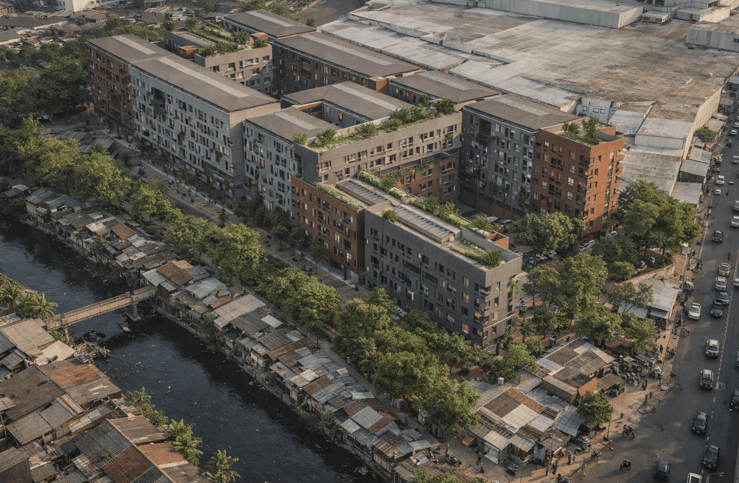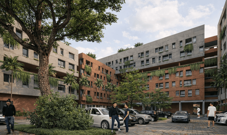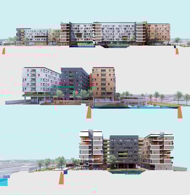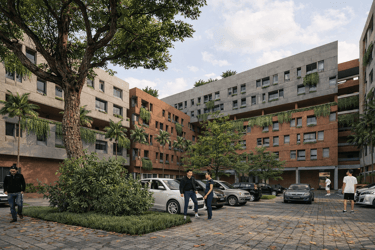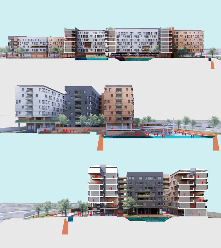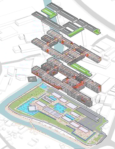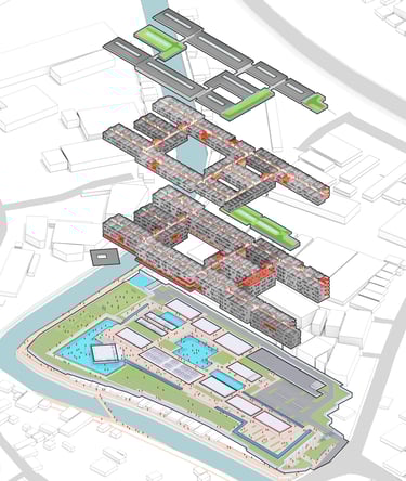 The crucial part of the design is to respond to the social context. How do we create a sustainable habitation with poverty issues in Jakarta? the design propose as low as 7-8 storey building with fragments of social space on each level. In order to do that, we used double loaded corridors to achieve efficiency, while skylights and voids connects each floor to provide shades and cross circulation. Massing studies are manage just like carving a stone into a permeable structures with lots of activity generator such as permaculture and workshops. Colors of the building is an abstraction of the historical fort color palette with grey as the subsidiary.