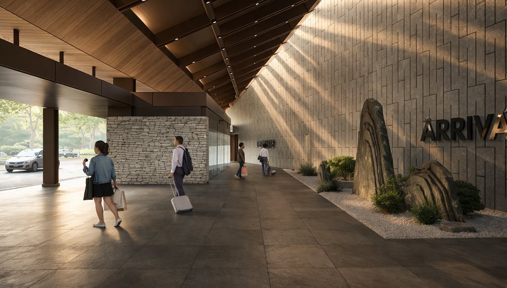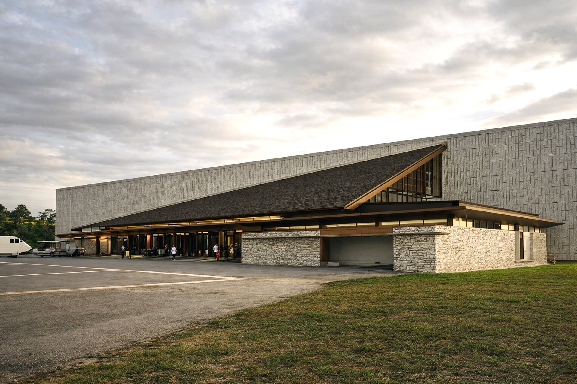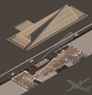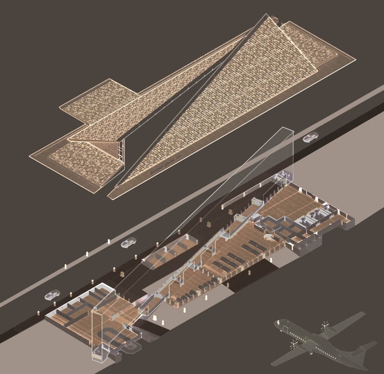 is a concept which driven by symmetrical patterns found in the local ornaments. The balanced roof was developed not just figuratively but also literally. A giant wall cut through diagonally into the site driven by structural grids, this automatically creates two zonation, the curb and the boarding area. A mirroring structures are erect on both zones with tilted large roof overhangs which sliced by the diagonal walls to reformed the building silhouette. As a result, the building mass conveys an effortless landmark on the exterior while maintaining different optical interior qualities for the users to perceive, which conclude the embodiment of Paritas Rabung.
